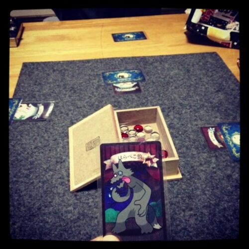 メシ食ったりなんだりした後に、まずは「赤ずきんは眠らない」からさっくりプレイ。 パーティ系の集まりでもちゃんと遊べるゲームで楽しい。罠なの?寝てるの?襲うの?襲わないの?の駆け引きでキャッキャウフフ。 そしてオオカミつながりで「ワンナイト人…